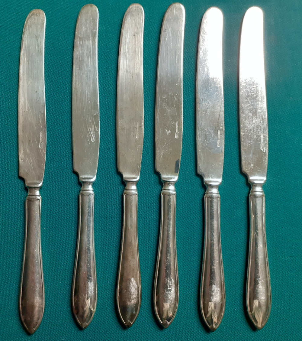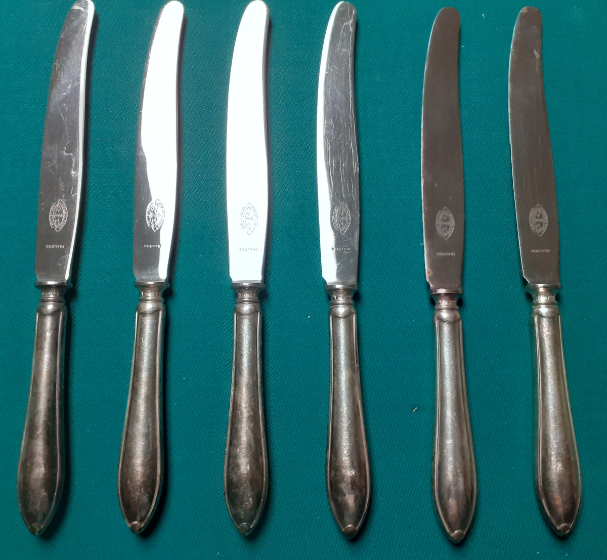 Art-Nr. BS 21-3, Preis: 20 EURO / 6 Stück 6 große Messer mit Monogramm Stempel Nyasilver (siehe oben auf dieser Seite) |