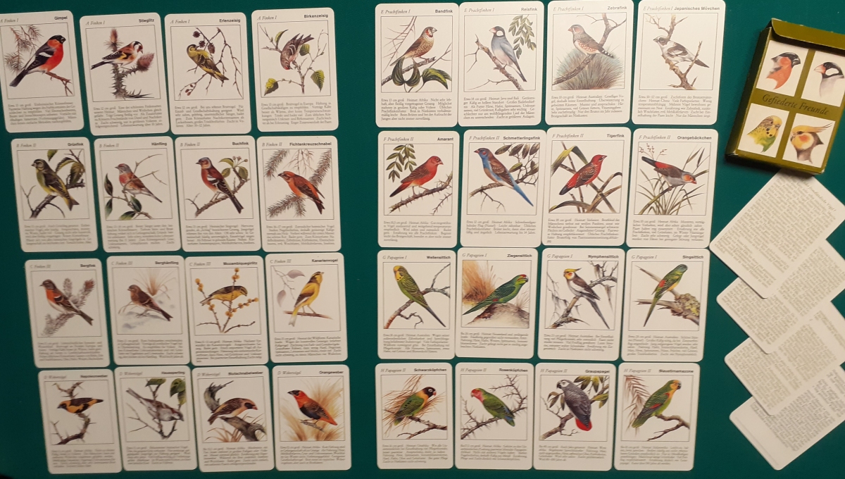 Art-Nr. KA 25-20, Preis: 9 EURO Gefiederte Freunde Hersteller: Verlag für Lehrmittel, Pössneck Alter: 1989 Anzahl der Karten: 8 x 4 Karten = 32 Karten Größe der Karten: 10 x 7 cm Rückseite: Gelbes Karomuster Zustand: offensichtlich nicht bespielt und sehr guter altersgemäßer Zustand Quartette: Kategorien: Finken I, Finken II, Finken III, Webervögel, Prachtfinken I, Prachtfinken II, Papageien I, Papageien II in Original-Pappschachtel mit 4 Leitkarten und ausführlicher Beschreibung der Motive; guter altersgemäßer Zustand |