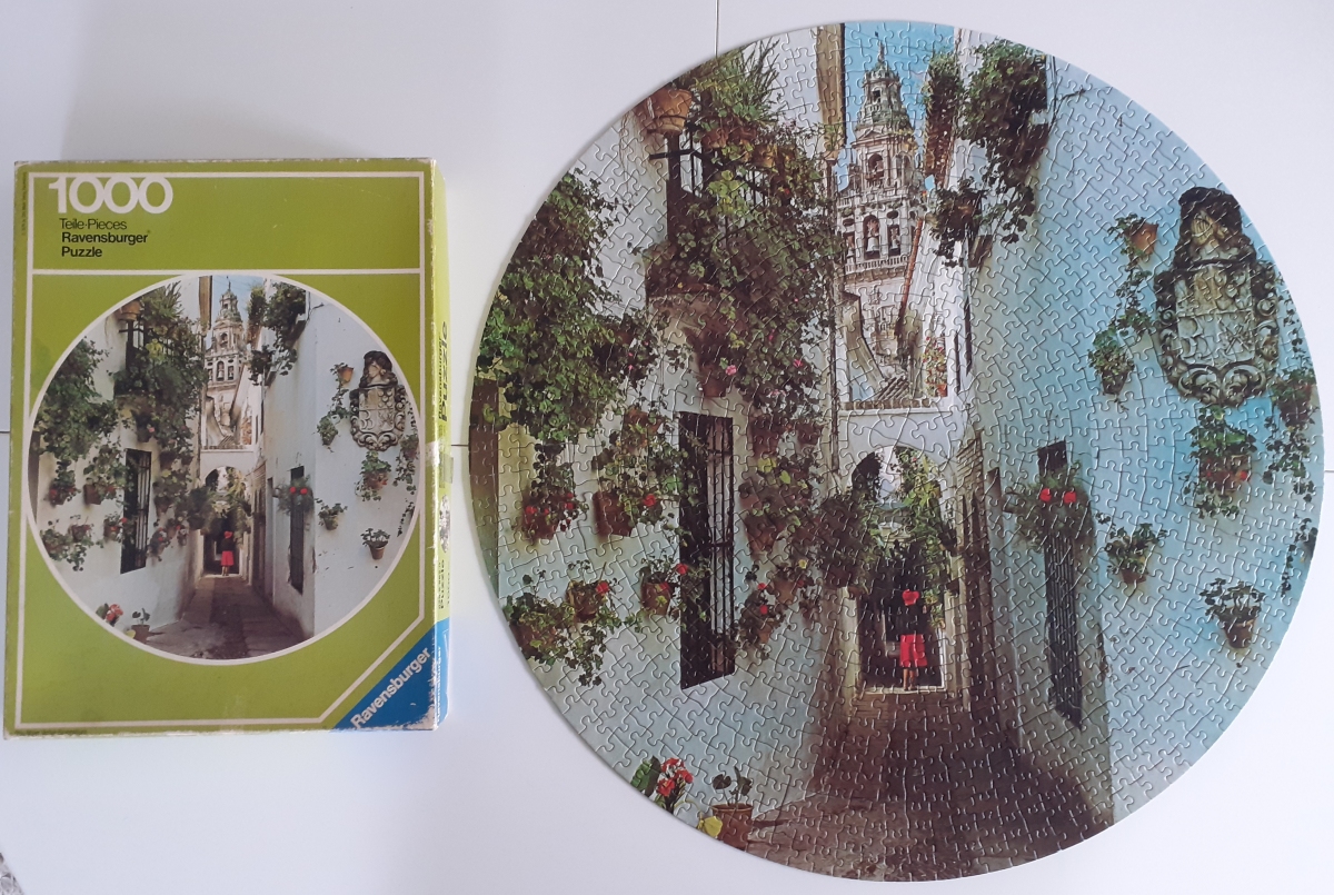 der Ravensburger Spiele 1000 Teile Art-Nr. SP-P26-6; 15 EURO Blumenstraße in Cordoba Ravensburger Spiel Nr. 625 5 562 9 Spiel von 1976 1000 Teile (natürlich vollständig - siehe Foto) ; kreisrundes Puzzle mit dem Durchmesser 60 cm; leichte Gebrauchsspuren; gepflegt und Teile altersgemäß gut erhalten; Karton an den Kanten bestoßen und berieben; Deckel an den Ecken etwas beschädigt. |