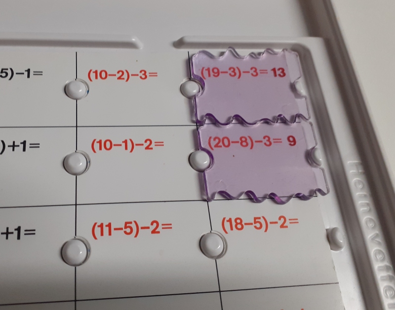 Art-Nr. SP-L22-1, Preis: 10 EURO Heinevetters Zehnertrainer 0 - 20 Hersteller: Heinevetter, Hamburg; das Spiel besteht aus 6 unverwüstlichen wasserabweisenden lackierten Pappkarten im Format 30 x 21 cm mit 600 Rechenaufgaben im Zahlenraum bis 20 mit Additionen und Subtraktionen. Die Aufgaben sind von unterschiedlichem Schwierigkeitsgrad. Die Lernenden können die Aufgaben abarbeiten und durch das Auflegen von Lösungsplättchen (aus Hartkunststoff) an der entsprechenden Stelle der Aufgabenstellung ein Puzzle erstellen. Die Lösungsplättchen passen nur dann zusammen, wenn die Aufgaben richtig gelöst wurden. Leider fehlen zwei von 50 Lösungsplättchen. Das Spiel lässt sich trotzdem gut bearbeiten. Solide Konstruktion ohne größere Gebrauchsspuren, insgesamt aber noch guter altersgemäßer Zustand. |