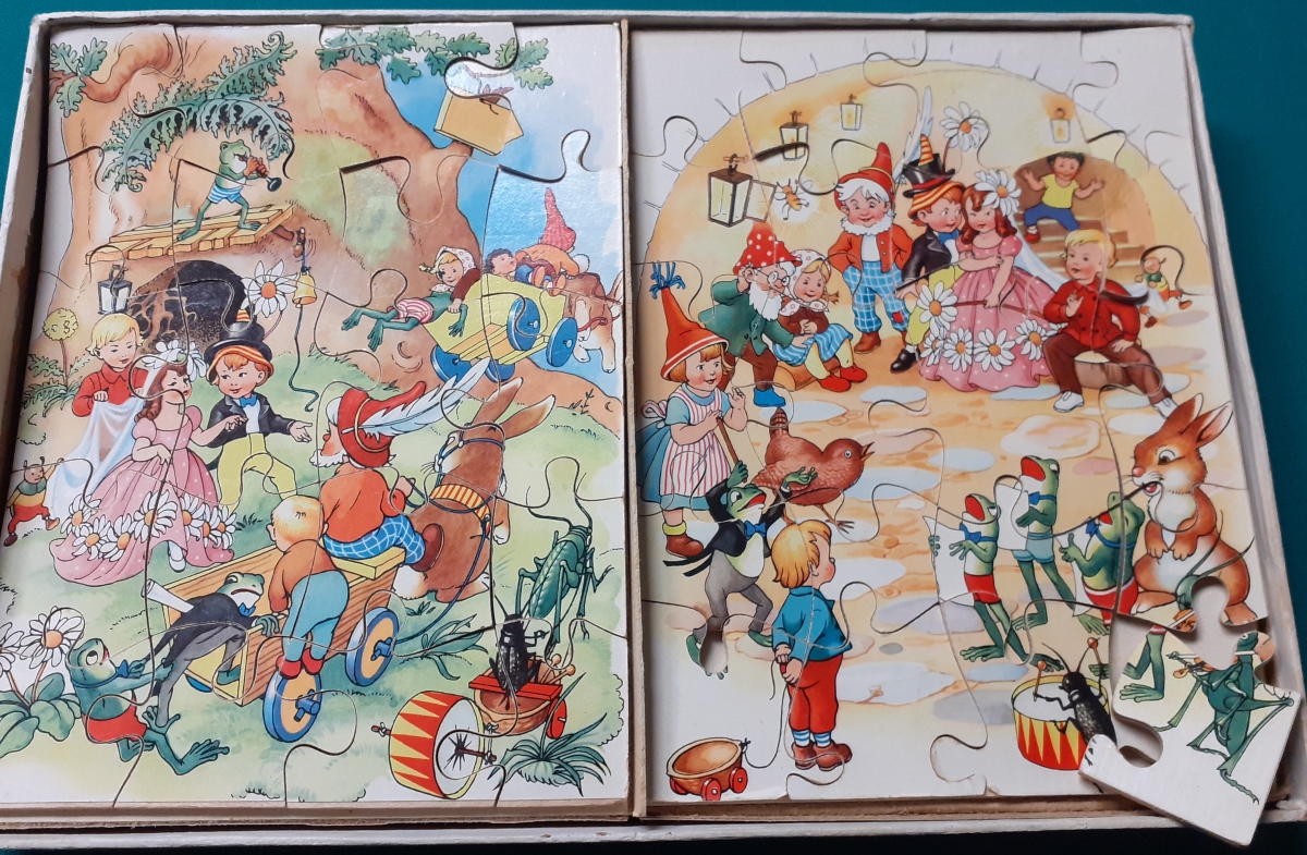 4 x 3 Teile Art-Nr. SP-P12-18, Preis: 9 EURO 4 Puzzles Bauernhof Holland; ca. 1980er Jahre, bestehend aus 4 Bauernhof-Motiven zu je drei Teilen (Größe je etwa 12 x 12 cm). Gesamtgröße des Holzkastens: 14 x 13 cm, farbig seidenmatt bemalte Holzoberfläche, sehr guter altersgemäßer Zustand; Deckel des Holzkastens mit einigen Strichen versehen; sonst ok. |
