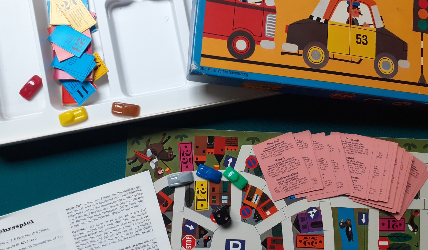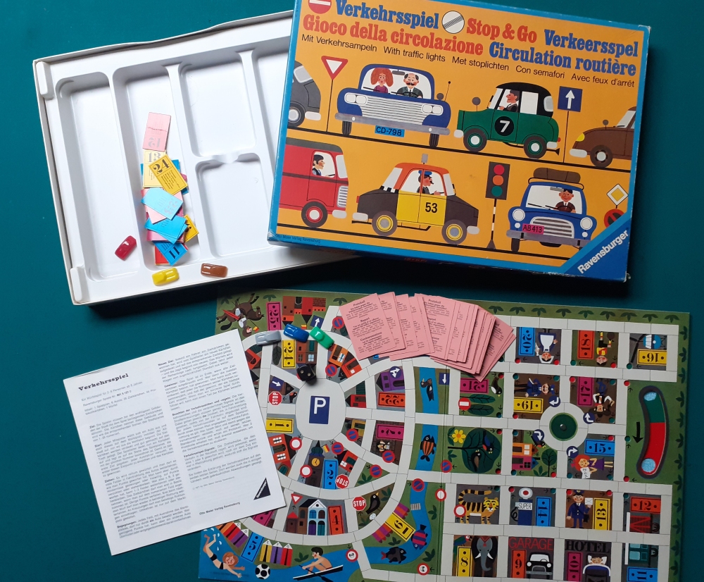 Art-Nr. SP-W25-1, Preis: 9 EURO Verkehrsspiel Ravensubrger Spiele von 1968; Nr. 601 5 121 0 (Internationale Ausgabe in 5 Sprachen Deutsch - Englisch, Französisch, Holländisch, Italienisch); Würfelspiel für 2 - 6 Mitspieler ab 8 Jahren; Inhalt des Kartons: 1 Spielplan (52 x 32 cm), 6 Hartplastik-Autos, 25 Zielkärtchen, 24 Protokollkärtchen, 1 Spielwürfel; Karton 38 x 27 x 4 cm; etwas an den Kanten bestoßen; Spiel in altersgemäßem sehr guten Zustand Zum Spielverlauf: |