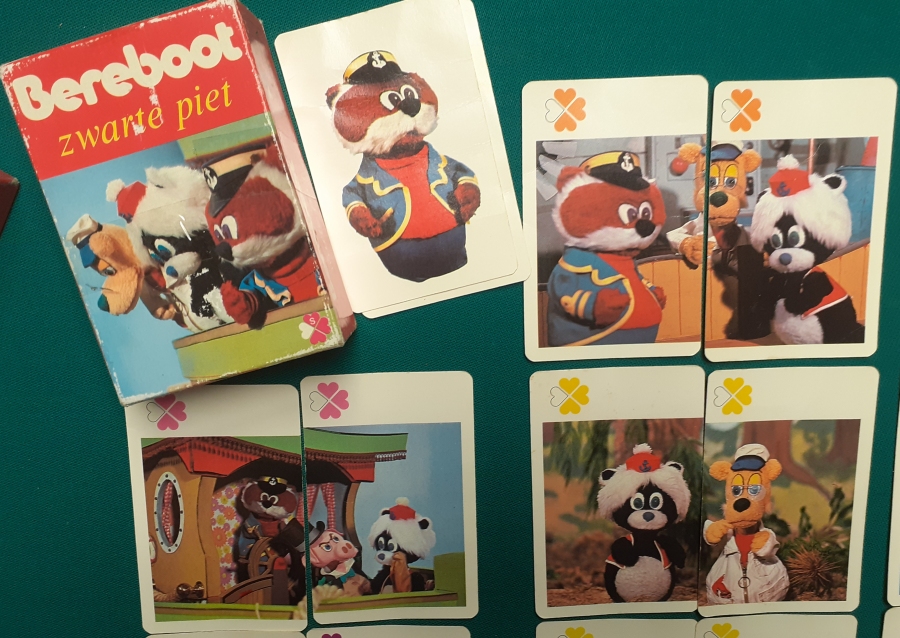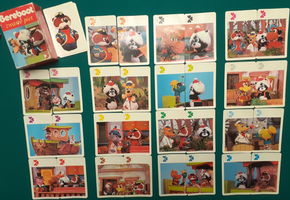 Art-Nr. KA-12-15, Preis: 6 EURO Bereboot - Schwarzer Peter Hersteller: Selecta, Holland; Nr. 633401 Alter: Ausgabe von 1976 Anzahl der Karten: 15 x 2 Karten + 1 Schwarzer Peter = 31 Karten Größe der Karten: 10 x 6,5 cm Rückseite: Selecta Emblem, rot-weiß Zustand: Karten z.T. mit einigen Knicken, zum großen Teil aber ok; insgesamt befriedigender altersgemäßer Zustand Paare: Jeweils sehr niedlich gezeichnete Tierpaare Im Pappkarton mit holländischer Spielanleitung; Karton an den Kanten bestoßen |