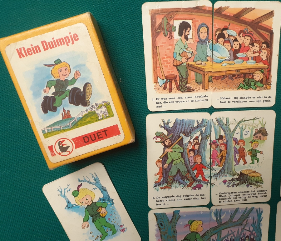 Art-Nr. KA 13-17, Preis: 5 EURO Klein Duimpje Hersteller: Otto Maier Benelux; Amersfoort, Holland, 1970er Jahre; vorhanden sind alle 15 Paare plus Klein Duimpje (= 31 Spielkarten); Größe 10 x 6,5 cm; zwei Karten gehören jeweils zusammen und ergeben eine Szene im Märchen. Text unterhalb der Bilder. Die Karten sind bespielt und haben zum Teil kleinere Knicke. Mit fester Pappschachtel und Leitkarte mit der holländischen Spielanleitung; Schachtel mit leichten Beschädigungen. |