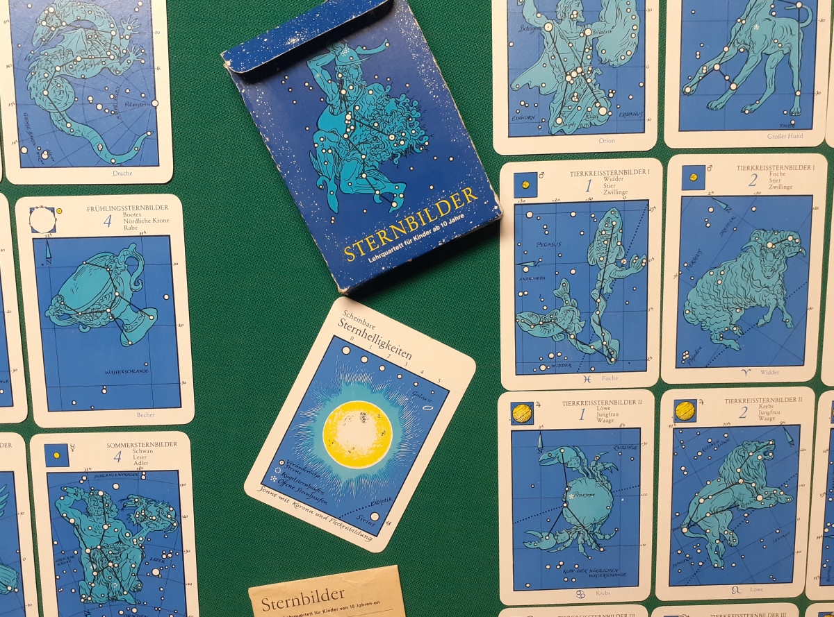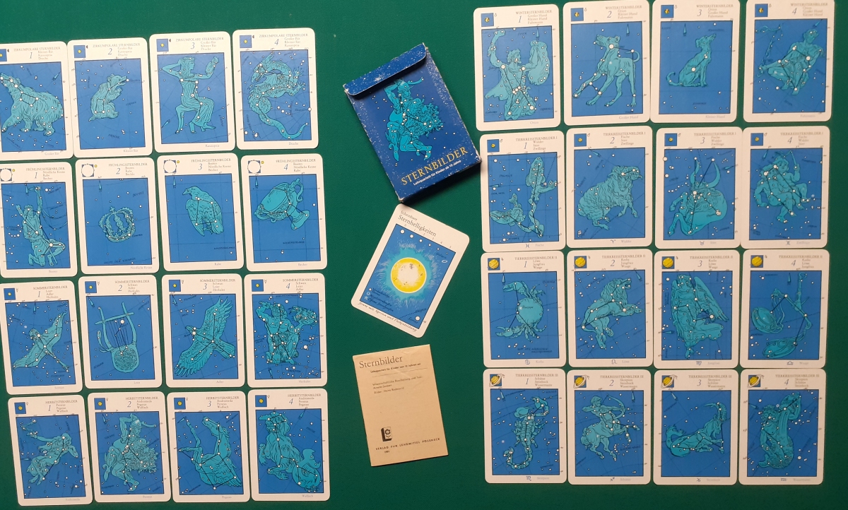 Verlag für Lehrmittel, Pössneck; Alter: Ausgabe von 1981 Anzahl der Karten: 8 Quartette mit allen 32 Karten + Peterkarte (Scheinbare Sternhelligkeiten) Größe der Karten: 10 x 7 cm Rückseite: Sternenhimmel dunkelblau-weiß Zustand: nicht bespielt, Karton leicht bestoßen; sehr guter altersgemäßer Zustand; Quartette: