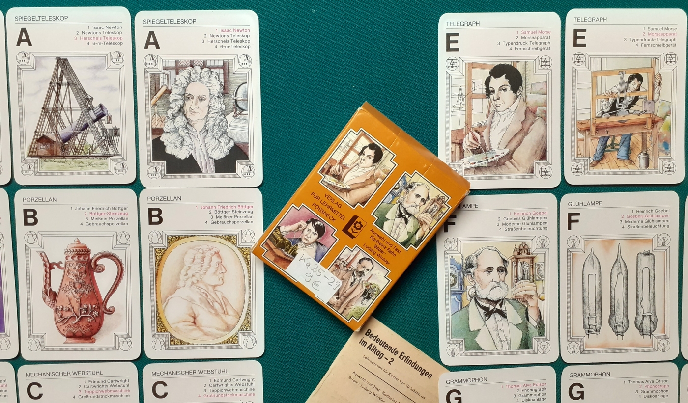 Verlag für Lehrmittel, Pössneck; Alter: Ausgabe von 1983 Anzahl der Karten: 8 Quartette mit allen 32 Karten Größe der Karten: 10 x 7 cm Rückseite: div. technische Geräte Zustand: nicht bespielt, Karton leicht bestoßen; sehr guter altersgemäßer Zustand; Quartette: