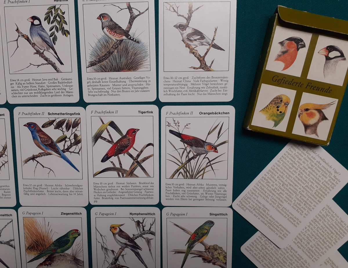 Art-Nr. KA 25-20, Preis: 9 EURO Gefiederte Freunde Hersteller: Verlag für Lehrmittel, Pössneck Alter: 1989 Anzahl der Karten: 8 x 4 Karten = 32 Karten Größe der Karten: 10 x 7 cm Rückseite: Gelbes Karomuster Zustand: offensichtlich nicht bespielt und sehr guter altersgemäßer Zustand Quartette: Kategorien: Finken I, Finken II, Finken III, Webervögel, Prachtfinken I, Prachtfinken II, Papageien I, Papageien II in Original-Pappschachtel mit 4 Leitkarten und ausführlicher Beschreibung der Motive; guter altersgemäßer Zustand |