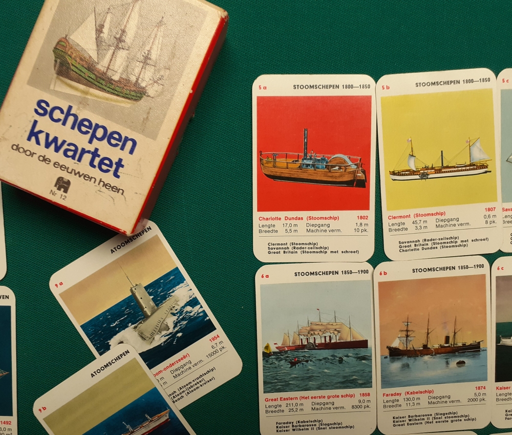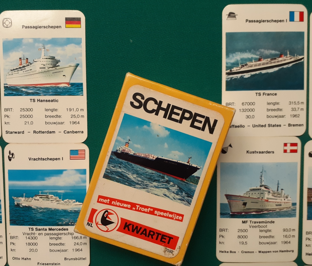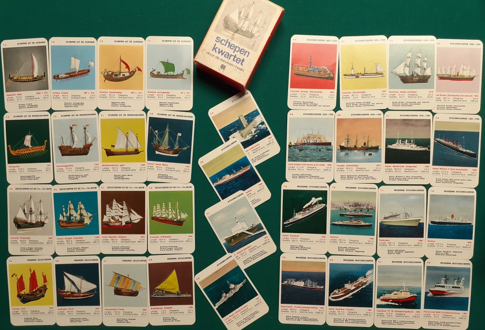 Art-Nr. KA 13-19, Preis: 7 EURO Schepen Hersteller: Jumbo, Holland Nr. 12 Alter: Ausgabe um 1965 Anzahl der Karten: 9 x 4 Karten = 36 Karten Größe der Karten: 10 x 6,5 cm Rückseite: Jumbo-Emblem blau Zustand: offenbar wenig bespielt und sehr gepflegt. Quartette: in originaler Pappbox - ziemlich an den Kanten bestoßen |