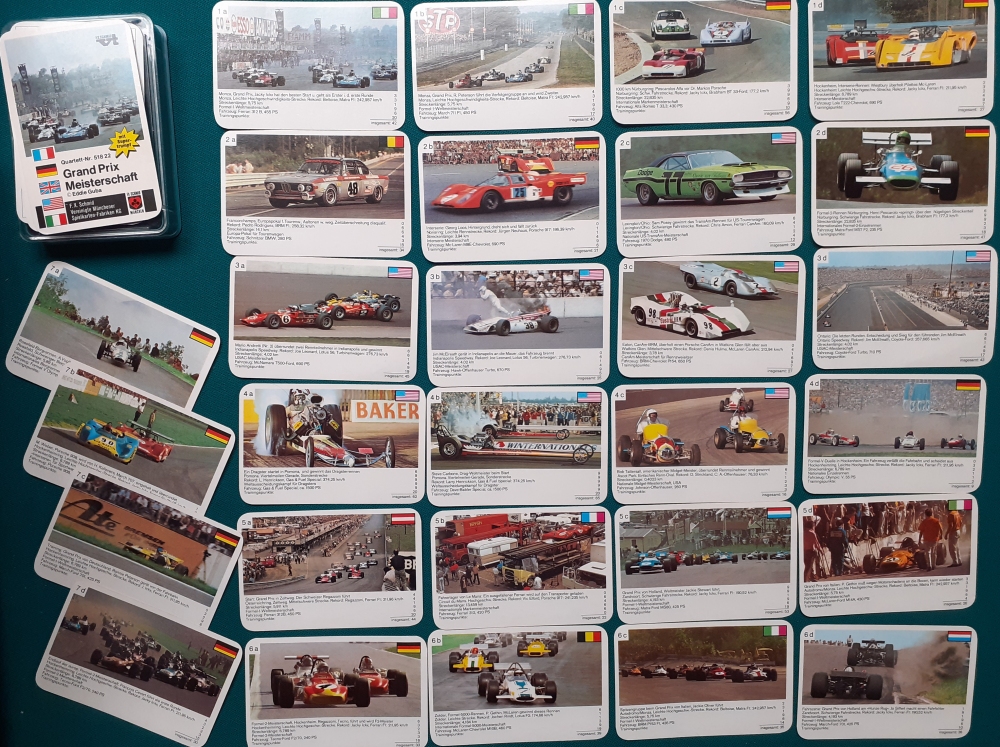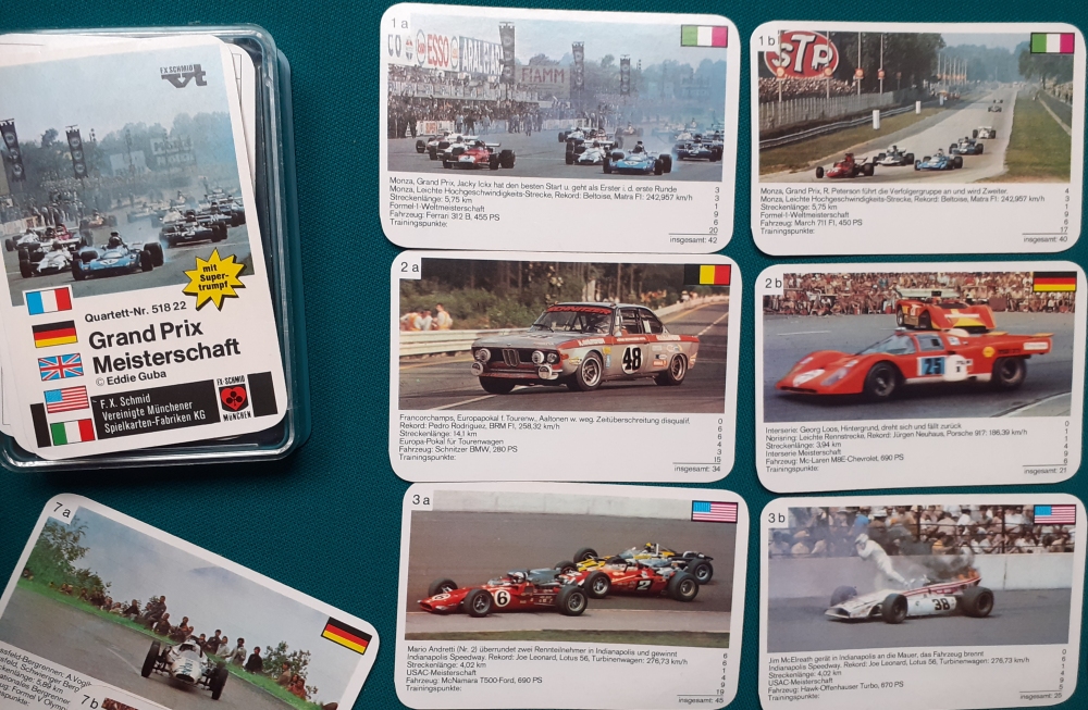 Art-Nr. SP-13-24, Preis: 8 EURO Grand Prix Meisterschaft Hersteller: Schmid Spielkarten, München Best.-Nr. 518 22 Alter: Ausgabe um 1975 Anzahl der Karten: 7 x 4 Karten = 28 Karten Größe der Karten: 10 x 6,7 cm Rückseite: Autos in blau weiß Zustand: leicht bespielt, aber sauber und gepflegt Quartette: in Original-Kunststoffbox mit heiler Original-Kunststoff-Box, der Leitkarte und zwei Bei-Karten |