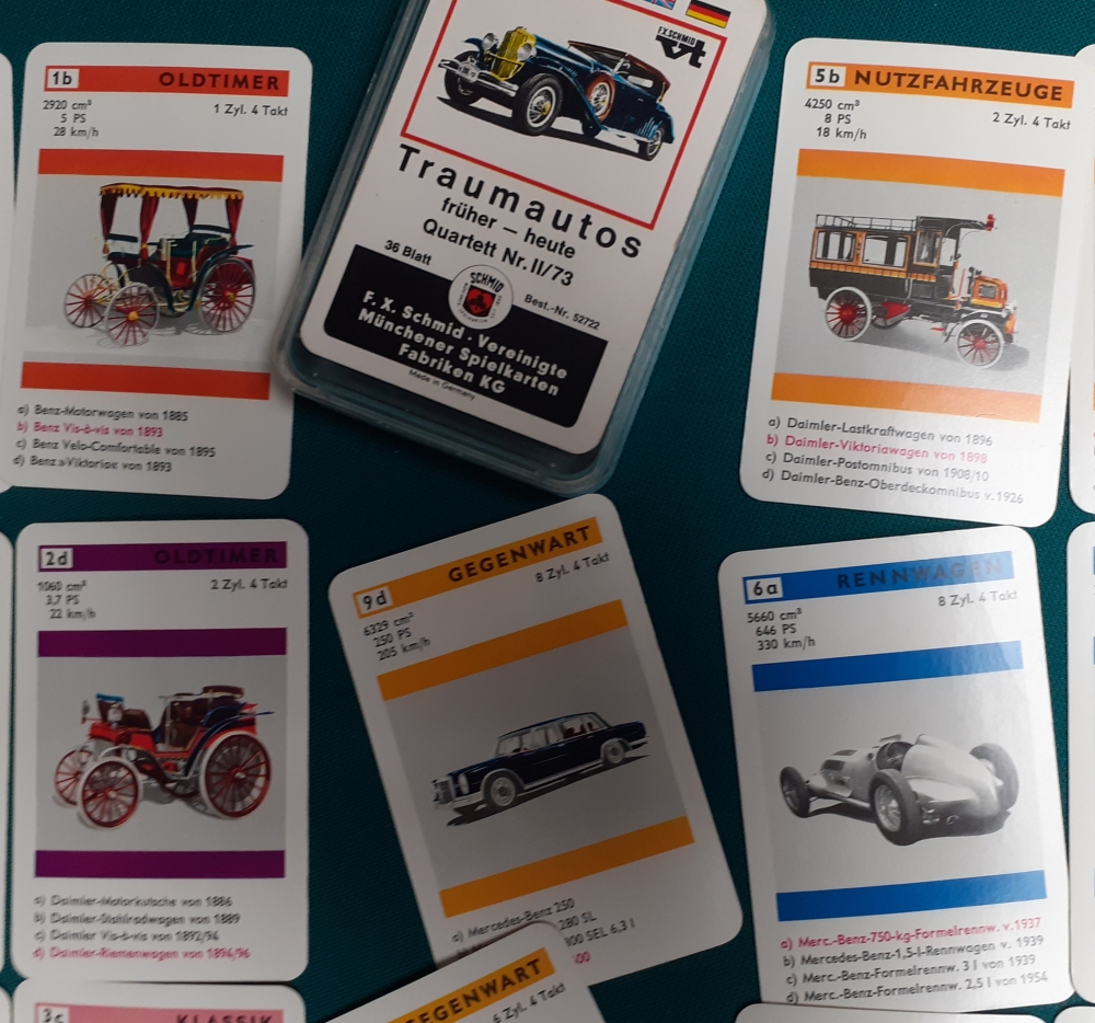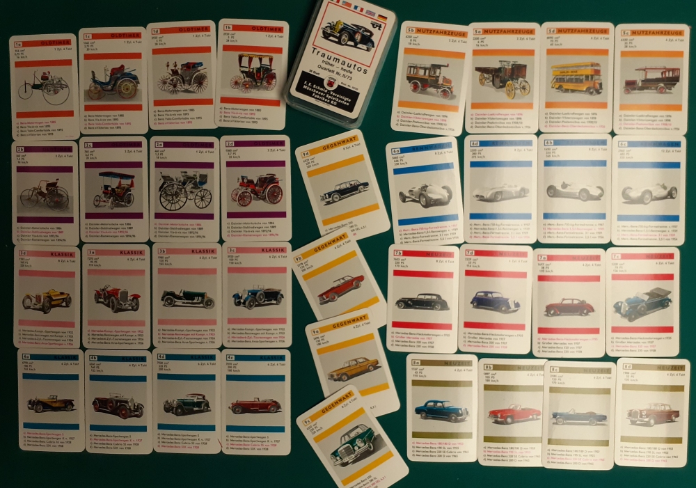 München Alter: Ausgabe um 1975 Anzahl der Karten: 9 x 4 Karten = 36 Karten Größe der Karten: 10 x 6,7 cm Rückseite: Autos in blau weiß Zustand: leicht bespielt, aber sauber und gepflegt Quartette: Diverse Kategorien von Mercedes-Fahrzeugen: Oldtimer, Klassik, Nutzfahrzeuge, Gegenwart ... in Original-Kunststoffbox |