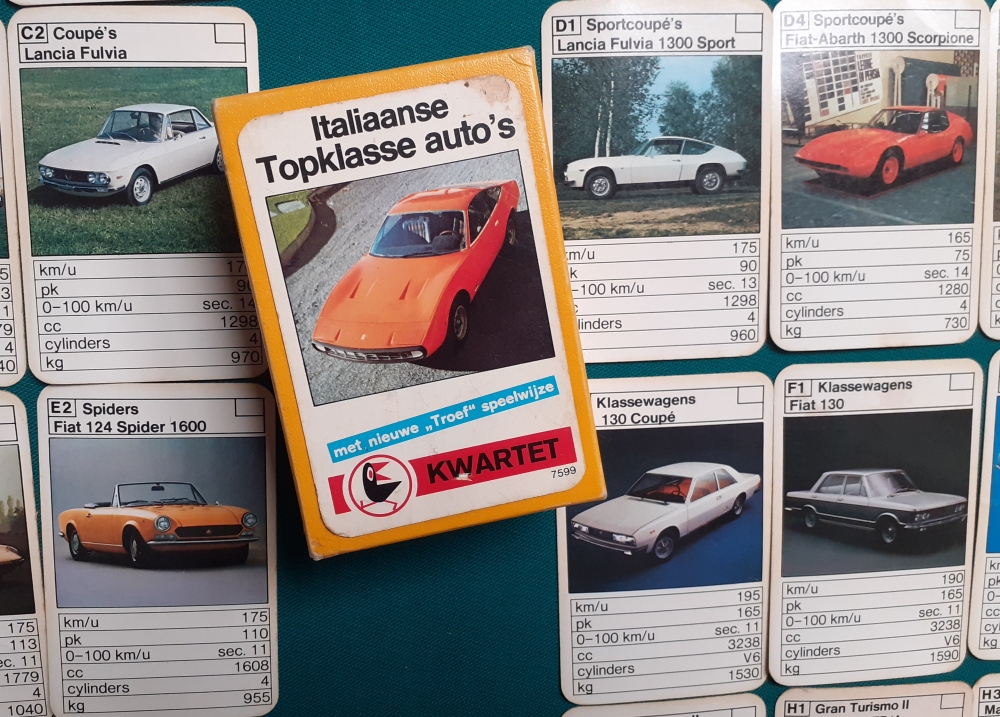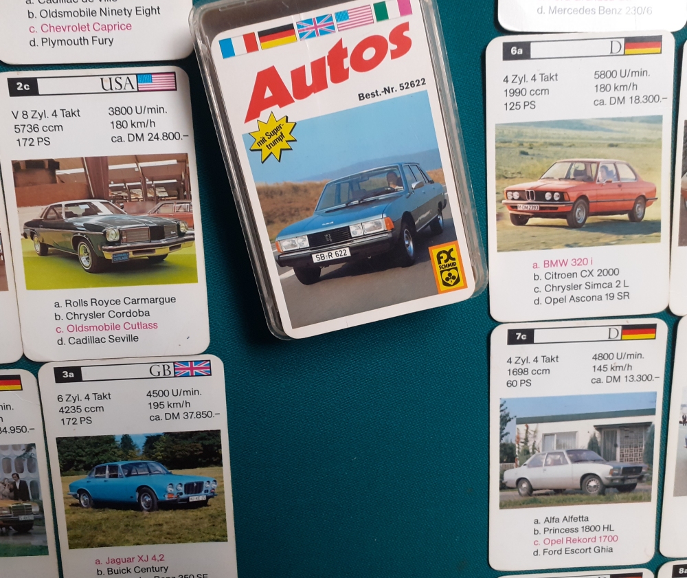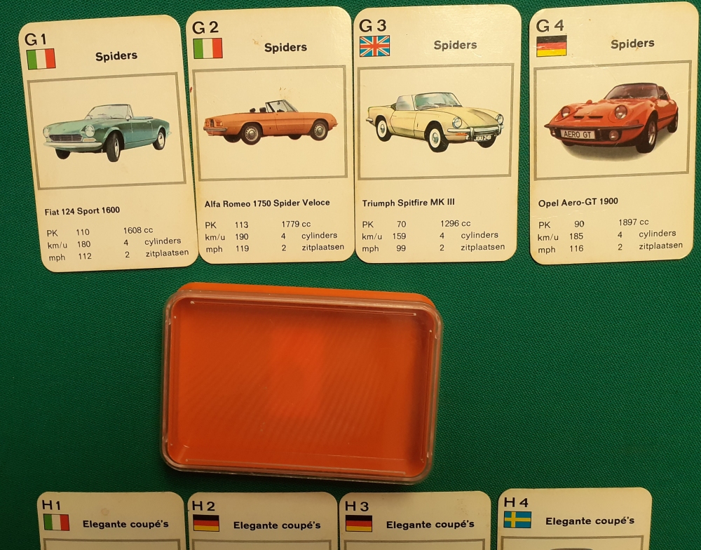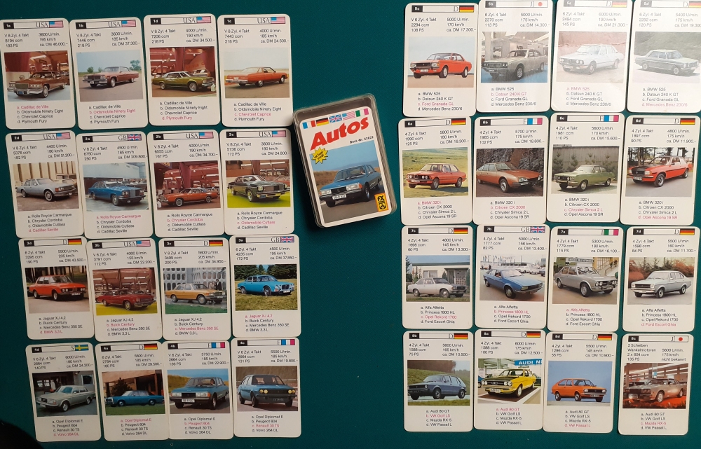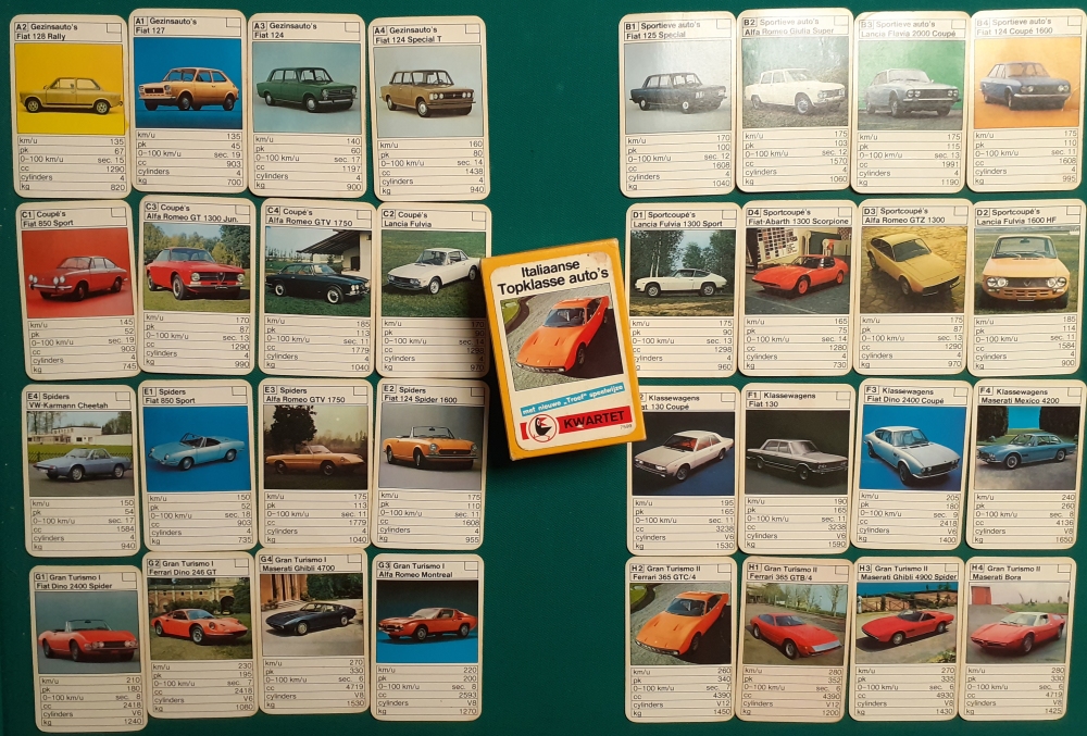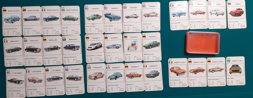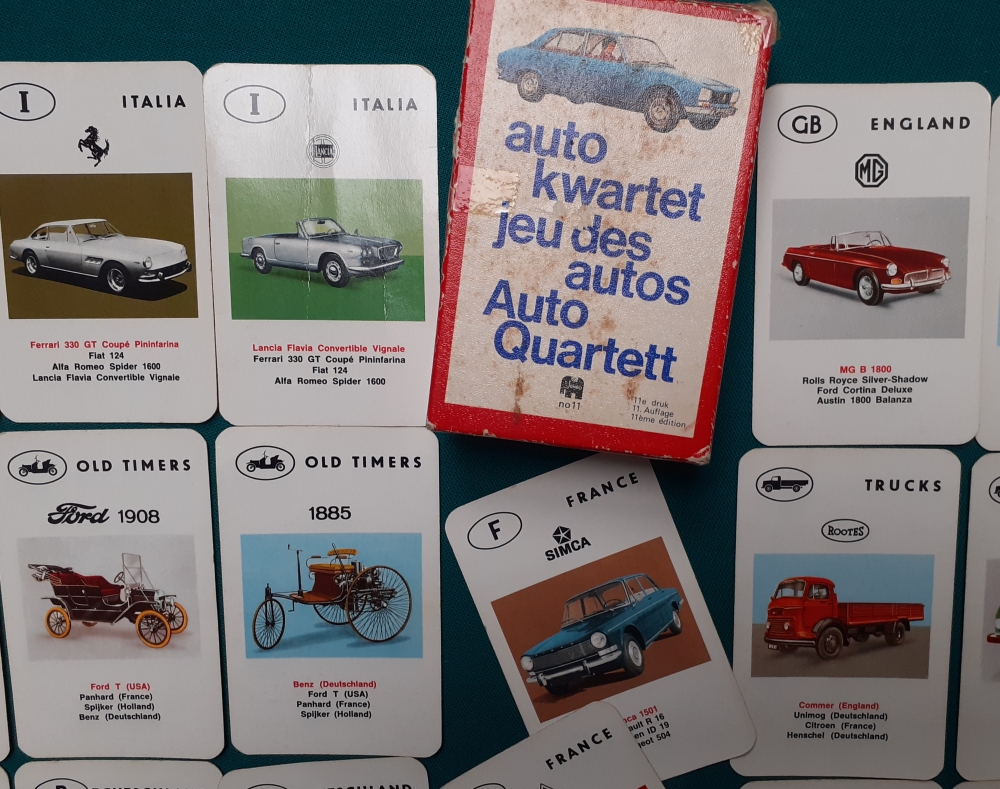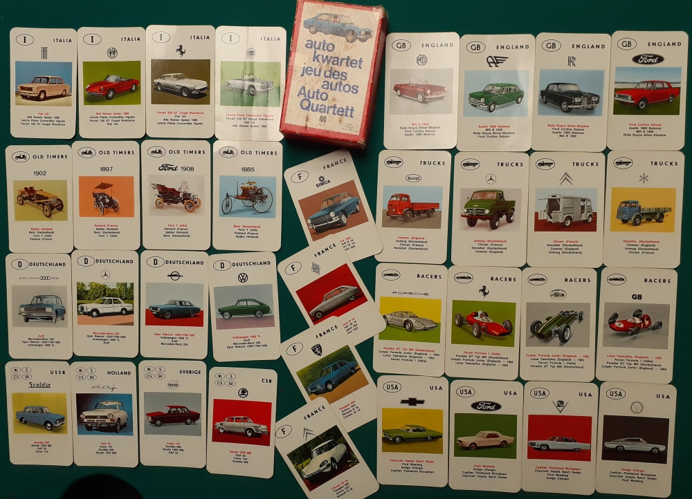 Art-Nr. KA 16-5, Preis: 9 EURO Auto Kwartet Hersteller: Niederlande ?? Alter: Ausgabe um 1960 Anzahl der Karten: 8 x 4 Karten = 32 Karten; ohne Leitkarte Größe der Karten: 10 x 6,5 cm Rückseite: Rot mit verschiedenen Verkehrsmitteln Zustand: Bespielt, aber sauber und insgesamt gepflegt. Quartette: im passenden Kunststoffkasten |