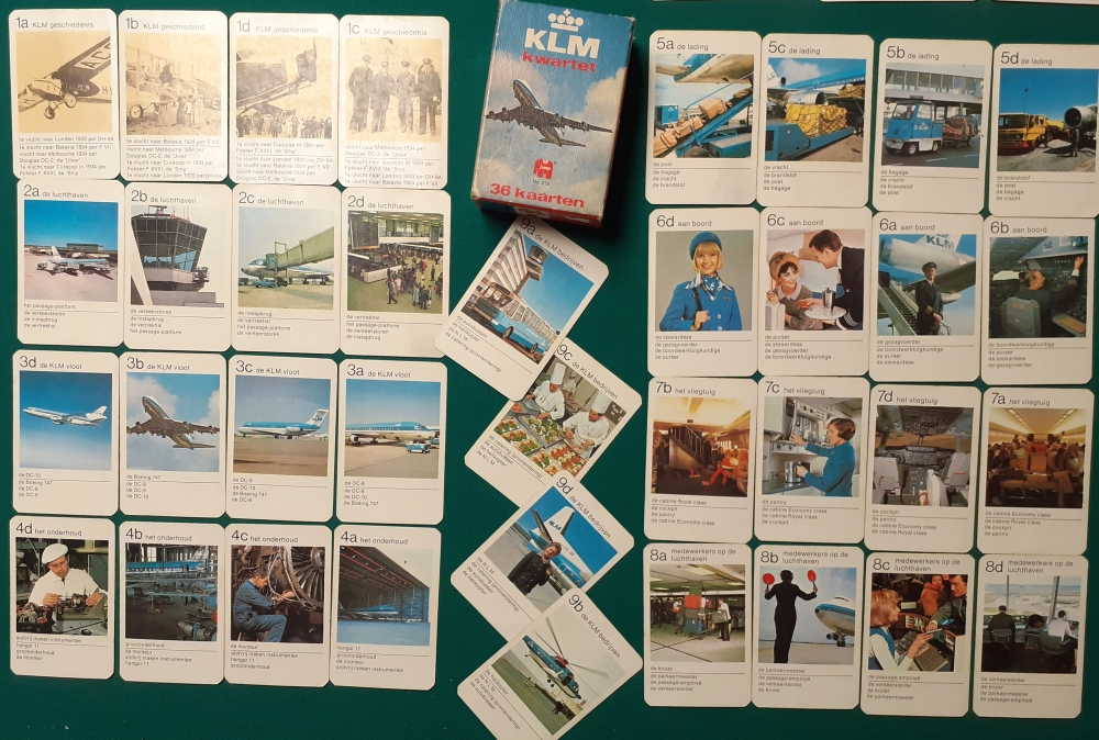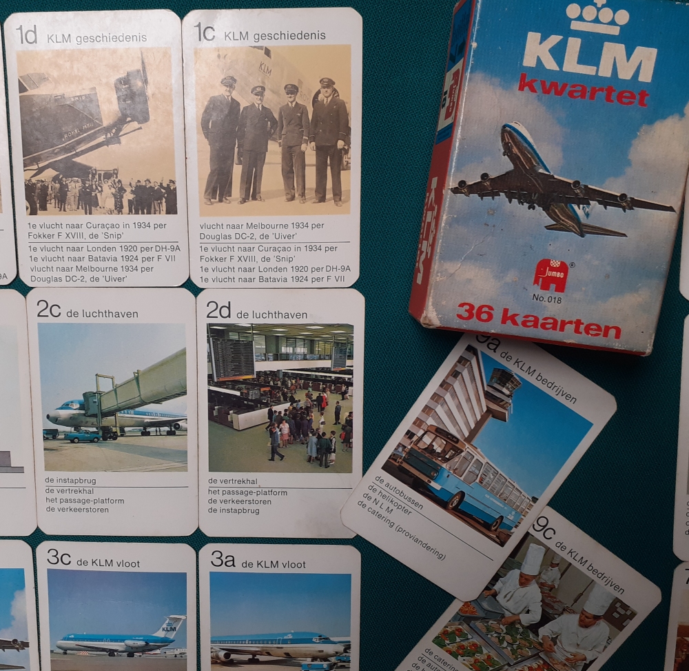 Art-Nr. KA 15-2, Preis: 9 EURO KLM - Kwartet Hersteller: Jumbo; Holland, Spiel-Nr. 018 Alter: Ausgabe um 1985 Anzahl der Karten: 9 x 4 Karten = 36 Karten Größe der Karten: 10 x 6,5 cm Rückseite: Jumbo-Emblem blau Zustand: Bespielt, aber sauber und insgesamt noch recht gepflegt. Quartette: in originaler Pappschachtel Schachtel bestoßen und auf der Unterseite bemalt |