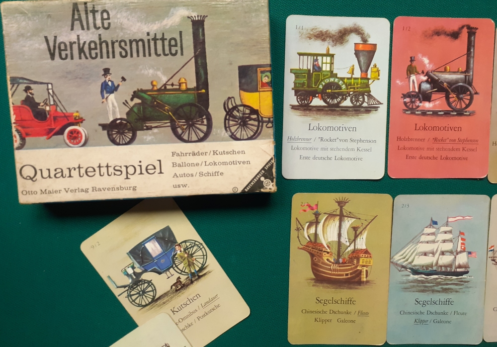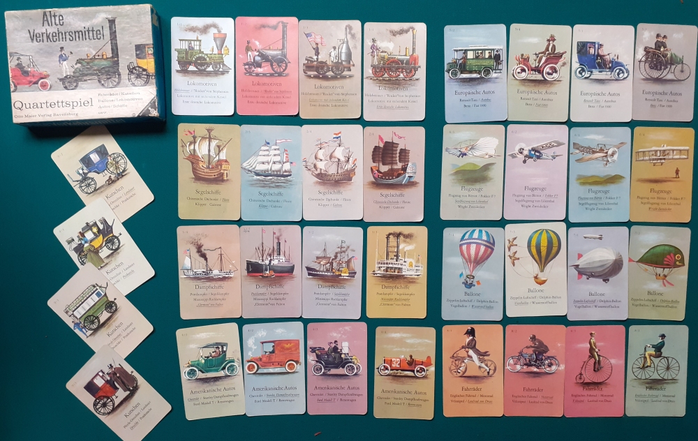 Art-Nr. KA 21-4, Preis: 9 EURO Alte Verkehrsmittel Hersteller: Ravensburger Spiele Deutschland Nr. 16.202 Alter: Ausgabe um 1960 Anzahl der Karten: 9 x 4 Karten = 36 Karten; ohne Leitkarte Größe der Karten: 10 x 6,6 cm Rückseite: Ravensburger Wappen Zustand: Bespielt, aber sauber und insgesamt gepflegt. Karton etwas fleckig und schmutzig. Quartette: Je 4 Motive der Bereiche Fahrräder, Kutschen, Ballone, Lokomotiven, Autos, Schiffe usw. im originalen Pappkarton |