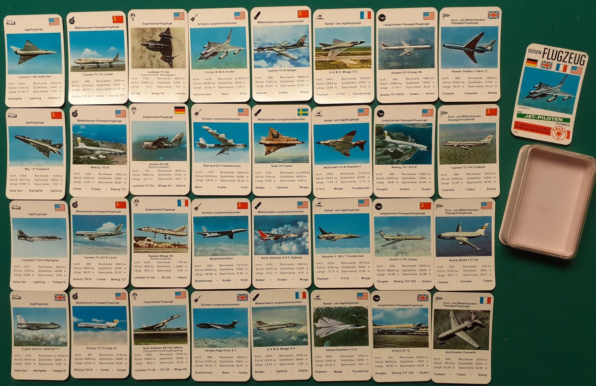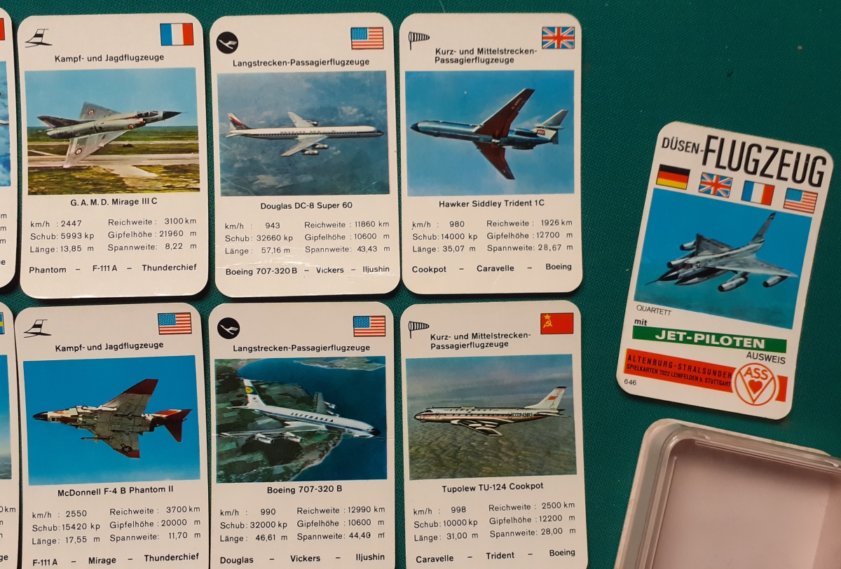 Art-Nr. KA 23-5, Preis: 9 EURO Düsen-Flugzeug Quartett Hersteller: ASS, Deutschland Spiel-Nr. 646 Alter: Ausgabe um 1970 Anzahl der Karten: 8 x 4 Karten = 32 Karten Größe der Karten: 10 x 6,5 cm Rückseite: Blaue Silouetten von Verkehrsmitteln Zustand: Bespielt, aber sauber und gepflegt. Quartette: in originaler Kunststoffbox gut erhalten |