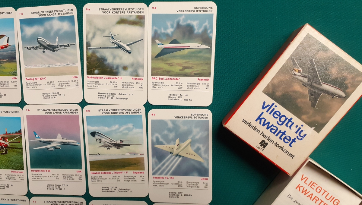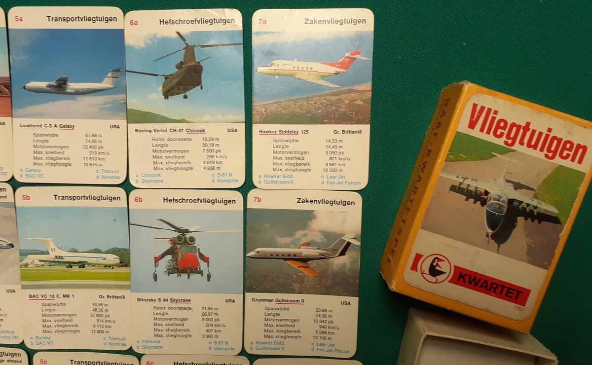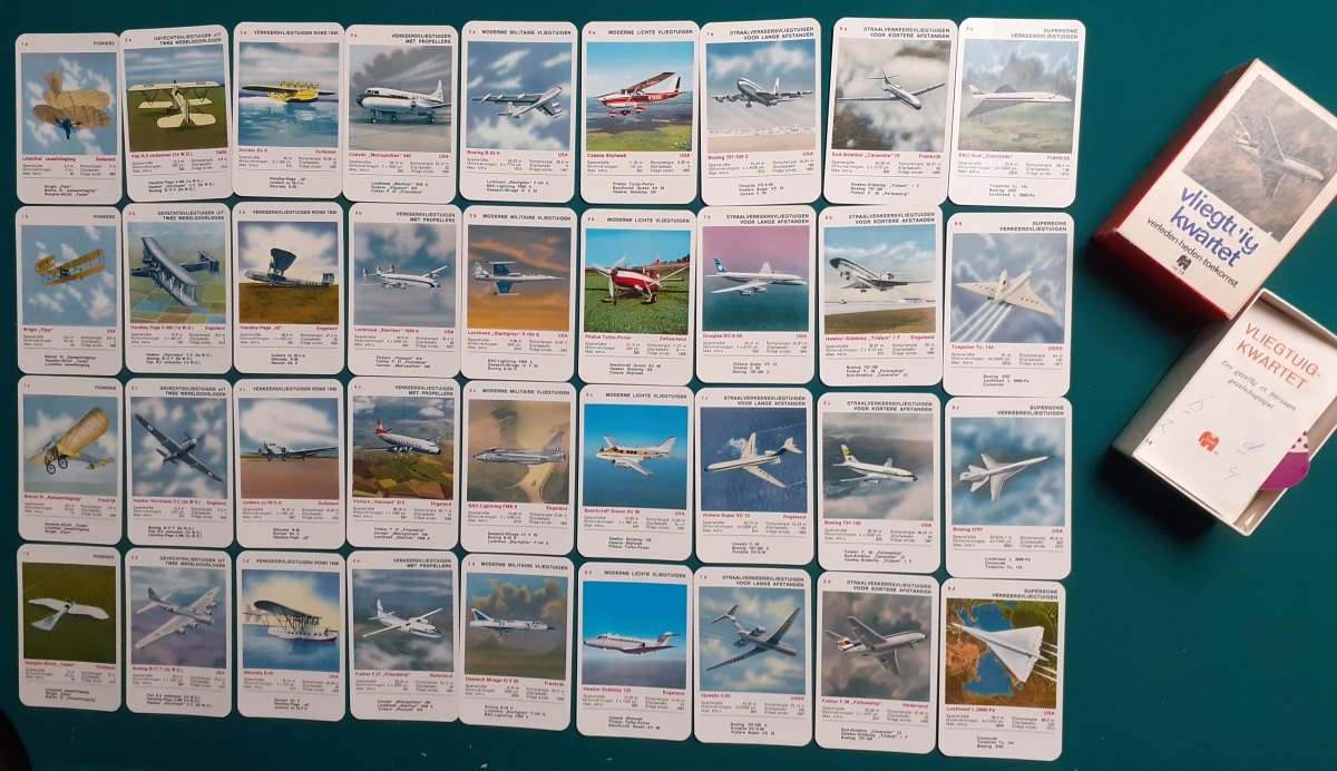 Art-Nr. KA 23-6, Preis: 8 EURO vliegtuig kwartet Hersteller: Jumbo Niederlande; Nr. 14 Alter: Ausgabe um 1975 Anzahl der Karten: 9 x 4 Karten = 36 Karten Größe der Karten: 10 x 6,5 cm Rückseite: Blaues Jumbo-Emblem Zustand: Bespielt, aber sauber und gepflegt. Quartette: in originaler Pappschachtel gut erhalten |
