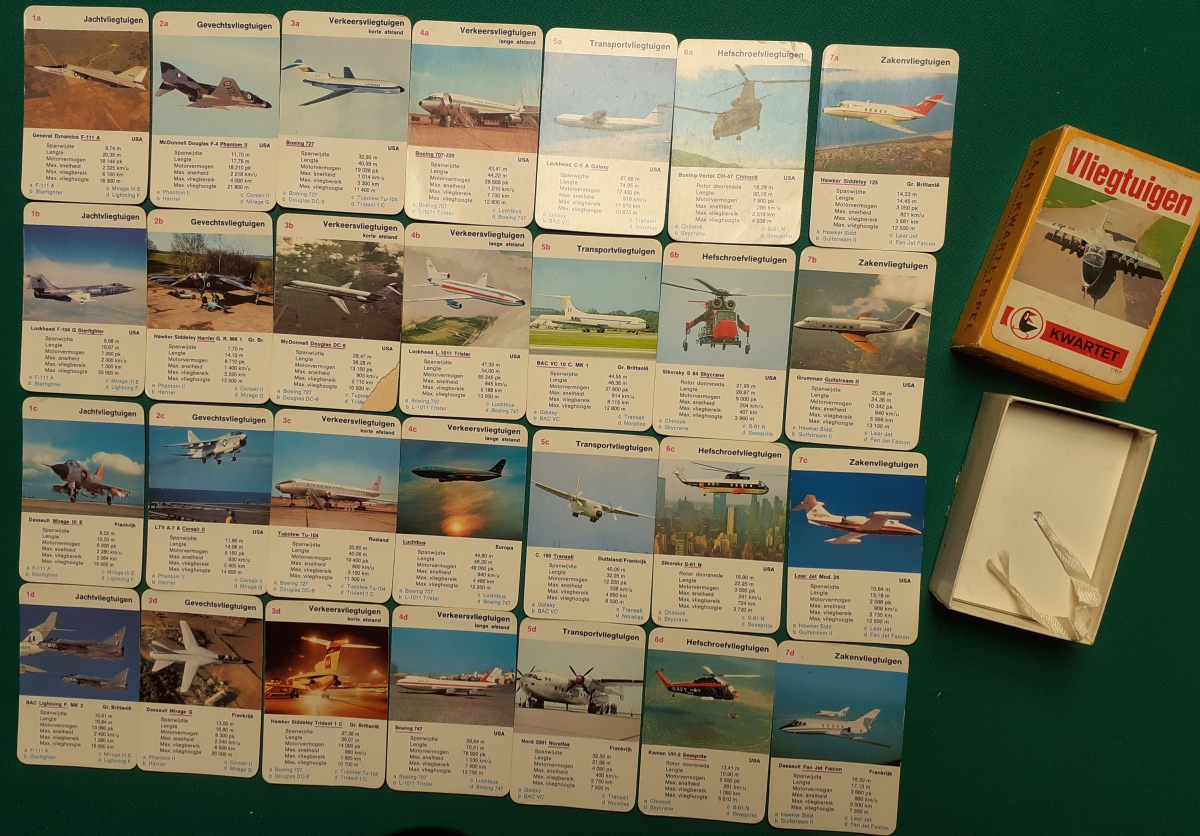 Art-Nr. KA 23-7, Preis: 7 EURO Vliegtuigen kwartet Hersteller: Jumbo Niederlande; Nr. 7707 Alter: Ausgabe um 1975 Anzahl der Karten: 7 x 4 Karten = 28 Karten Größe der Karten: 10 x 6,5 cm Rückseite: Blaue Silouetten von Flugzeugen Zustand: Bespielt, aber sauber und gepflegt - eine Karte beschädigt (siehe Abbildung) - aber ohne Textverlust Quartette: in originaler Pappschachtel gut erhalten |