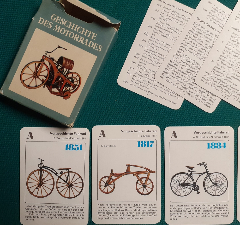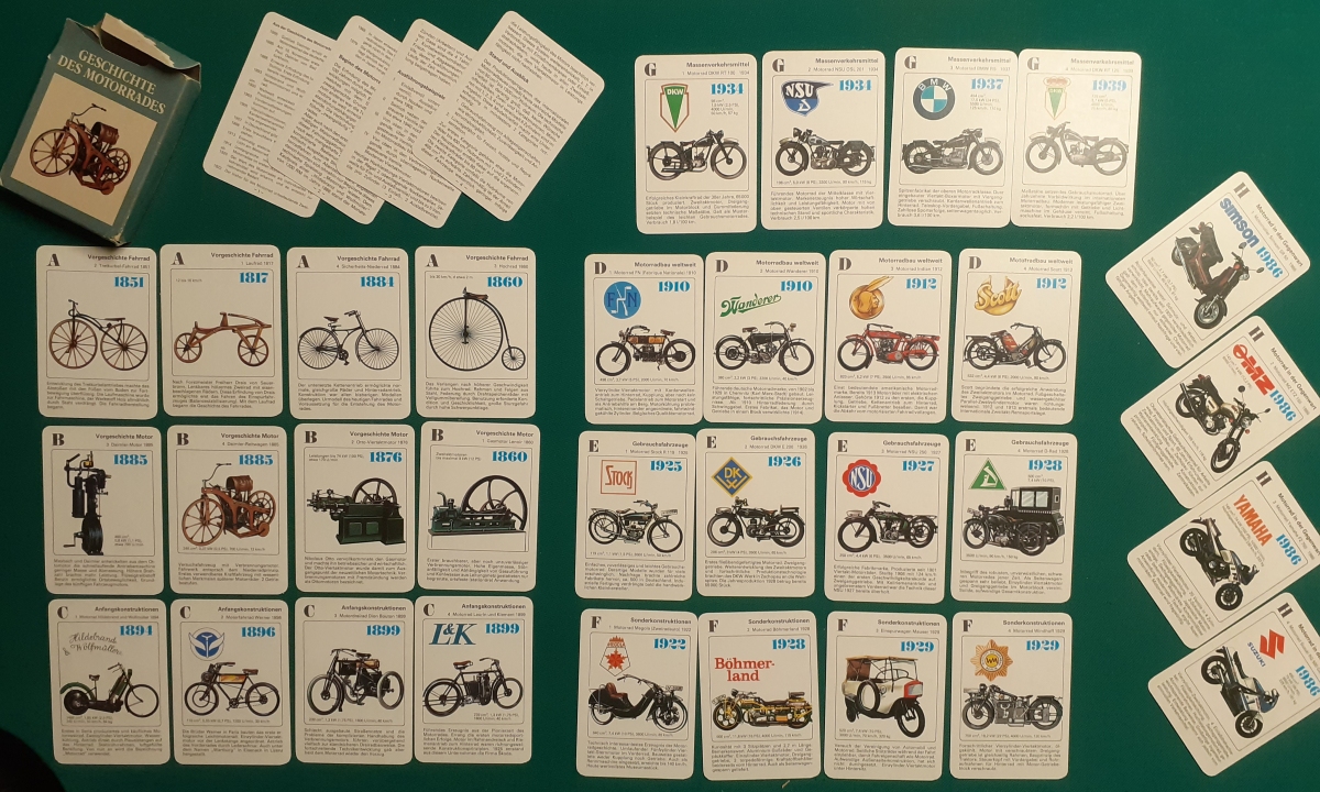 Art-Nr. KA 24-2, Preis: 7 EURO Geschichte des Motorrades Hersteller: Verlag für Lehrmittel Pössneck, DDR Alter: Ausgabe von 1987 Anzahl der Karten: 8 x 4 Karten = 32 Karten; ohne Leitkarte Größe der Karten: 10 x 7 cm Rückseite: Wappen der Automarken Zustand: offensichtlich kaum bespielt, sauber und gepflegt. Karton etwas an den Kanten bestoßen. Quartette: Je 4 Motive der Bereiche sortiert nach Alter von 1851 bis 1929. im originalen Pappkarton |