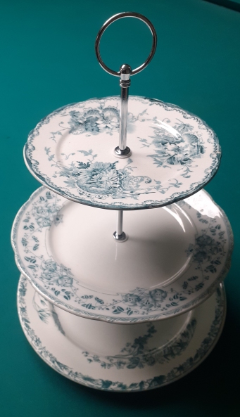 Art-Nr. P-6e, Preis: 19 EURO Etagere aus drei dunkelgrünen Tellern der schwedischen Manufakturen Rörstrand und Gustavsberg aus den 1920er Jahren: unterer Teller Flora(Gustavsberg),