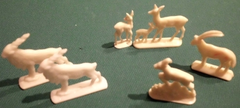 Art-Nr. SOMA-21-12, Preis: 5 EURO Gruppe mit 6 Figuren: Hersteller: nicht gemarkt Größe z. B. Ricke mit Kitz: 4 x 3,5 cm |