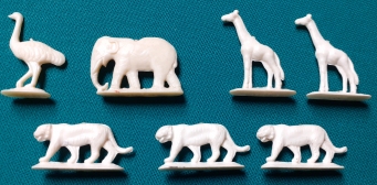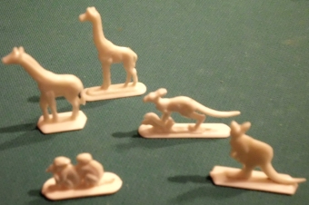 Art-Nr. SOMA-22-12, Preis: 4 EURO Gruppe mit 5 Figuren: Hersteller: nicht gemarkt Größe z. B. Giraffe: 4,5 x 2,5 cm |