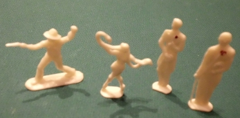 Art-Nr. SOMA-30-12, Preis: 4 EURO Gruppe mit 4 Figuren: Hersteller: nicht gemarkt Größe z. B. schießender Cowboy: 3,5 x 3,5 cm |