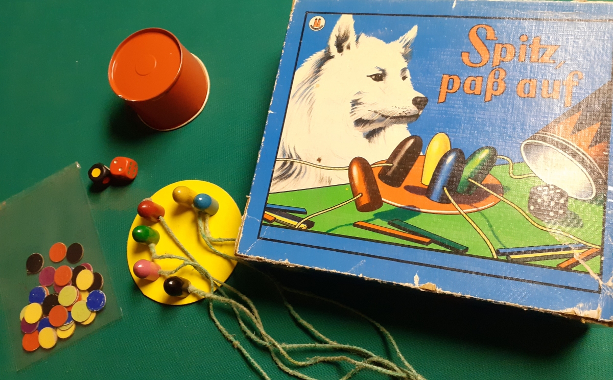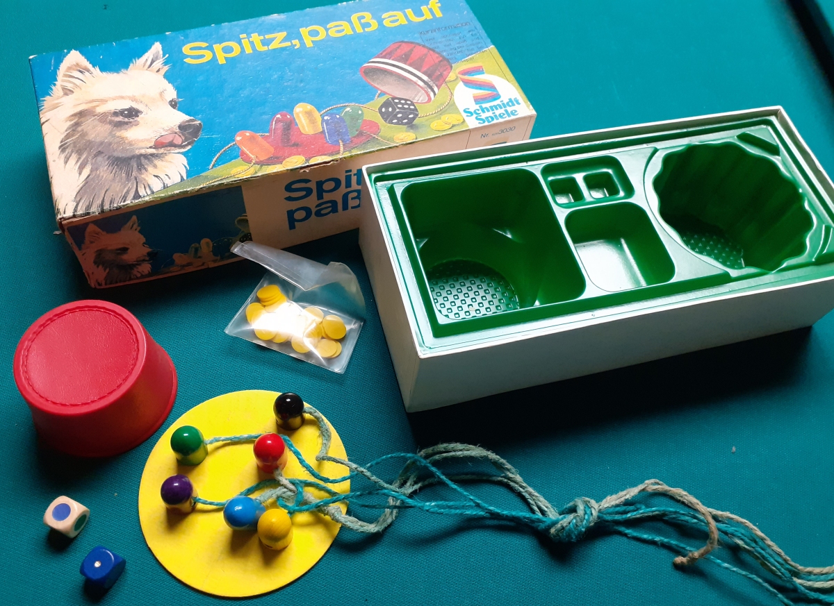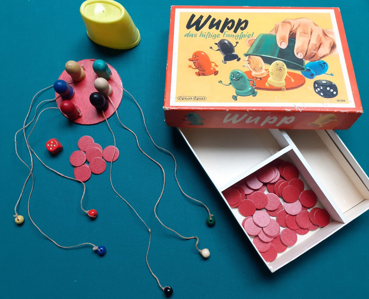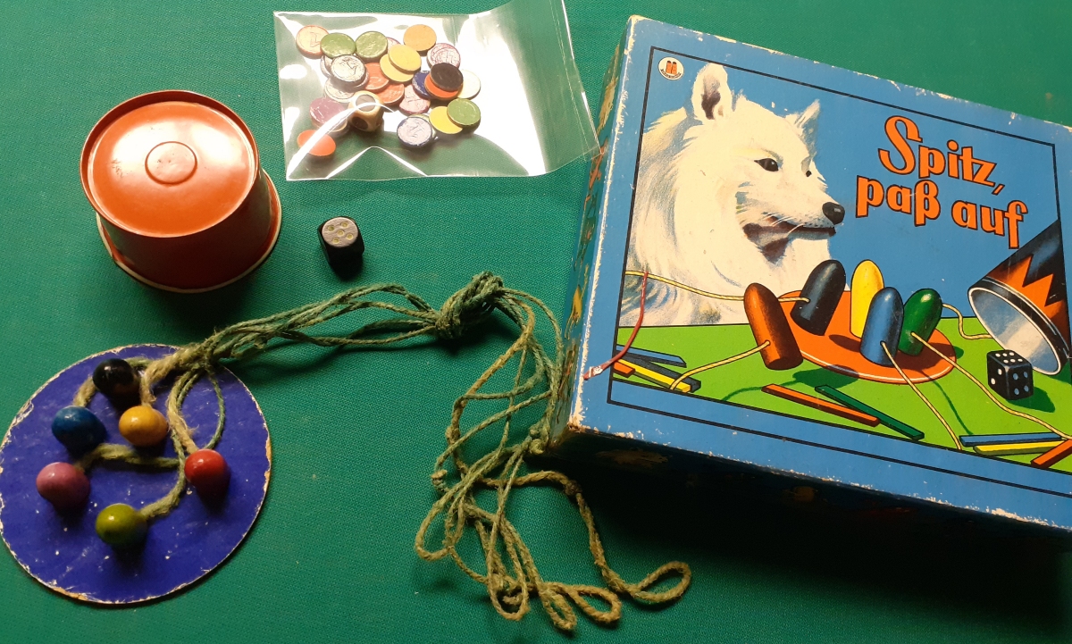 Art-Nr. SP-Fa20-10, Preis: 9 EURO Hersteller: Spear Spiele, Nürnberg; um 1955; Pappkarton im Format 20 x 14 x 4,5 cm; Spielmaterial: 6 farbige Holzspielsteine am Band; dazu ein Spielwürfel. Ein Mitspieler würfelt mit dem Kunststoffbecher - bei 1 oder 6 müssen die anderen Mitspieler ihre Steine mittels Ziehen am Band von der Pappunterlage bringen, damit sie nicht vom Würfler gefangen werden. Die roten Spielmarken müssen beim "Gefangenwerden" oder beim unnötigen Wegziehen abgegeben werden. Spiel und Karton in gutem altersgemäßen Zustand. |