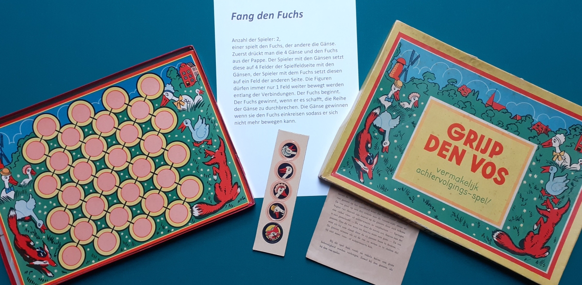 - Spiel Verfolgungsspiel für 2 Personen, Holland, 1930er Jahre, Hersteller: VNF; Spielplan 34 x 24 cm mit 5 Spielplättchen (4 Gänse und 1 Fuchs) -noch eingestanzt und nicht benutzt; mit holländischer Spielanleitung (und deutscher Übersetzung!); Pappschachtel im Format 35 x 25 x 2,5 cm, Schachtel leicht beschädigt, Spiel in altersgemäßem guten Zustand Zum Spielverlauf: |