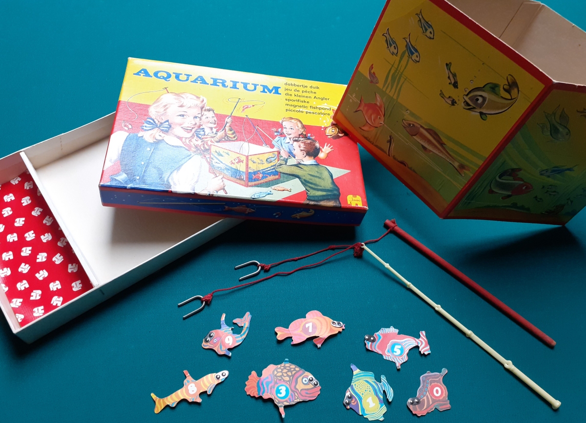 Art-Nr. SP-Fa20-1, Preis: 6 EURO Aquarium Hersteller: Jumbo Spiele, Niederlande; um 1960; Pappkarton im Format 23 x 17 x 4 cm; Spielmaterial: 7 Stücke Angelgut aus Pappe; 2 Angeln mit Magneten am Ende; Aquarium in Würfelform in der Höhe 15 cm; einige Pappfische mit Knicken; Spiel insgesamt in recht gutem altersgemäßen Zustand. |