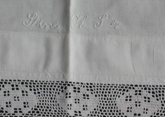 Artikel Nr. T-2-16; 6 EURO Baumwollgardine mit Häkelspitze, Weißstickerei Monogramm "Stina HS"; mit Schlaufe für eine Gardinenstange Maße: 45 x 80 cm |