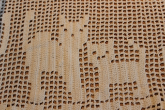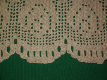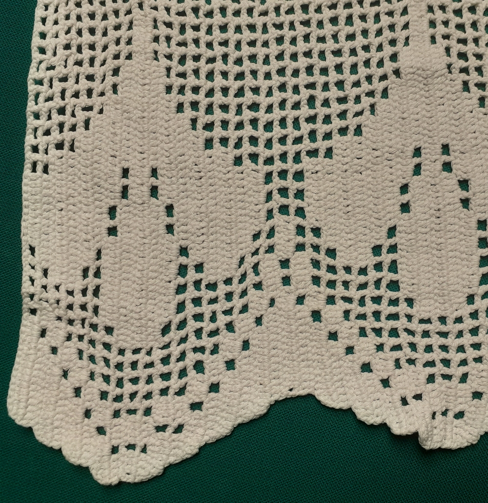 Artikel Nr. T-276-04; 5 EURO Häkelgardine Handarbeit, beigefarben, am oberen Rand auf der Rückseite ein Baumwollband aufgenäht zum Befestigen von Gardinenhaken Maße: 23,5 x 81 cm |