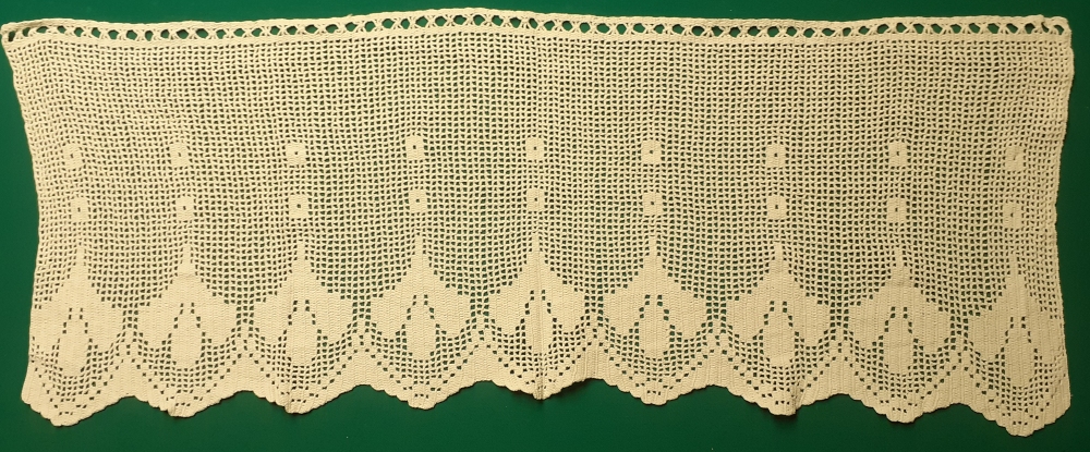 Artikel Nr. TG20-1; 10 EURO Häkelgardine Handarbeit, naturfarben; eingehäkelter Lochrand für eine Gardinenstange Maße: 27 x 120 cm |
